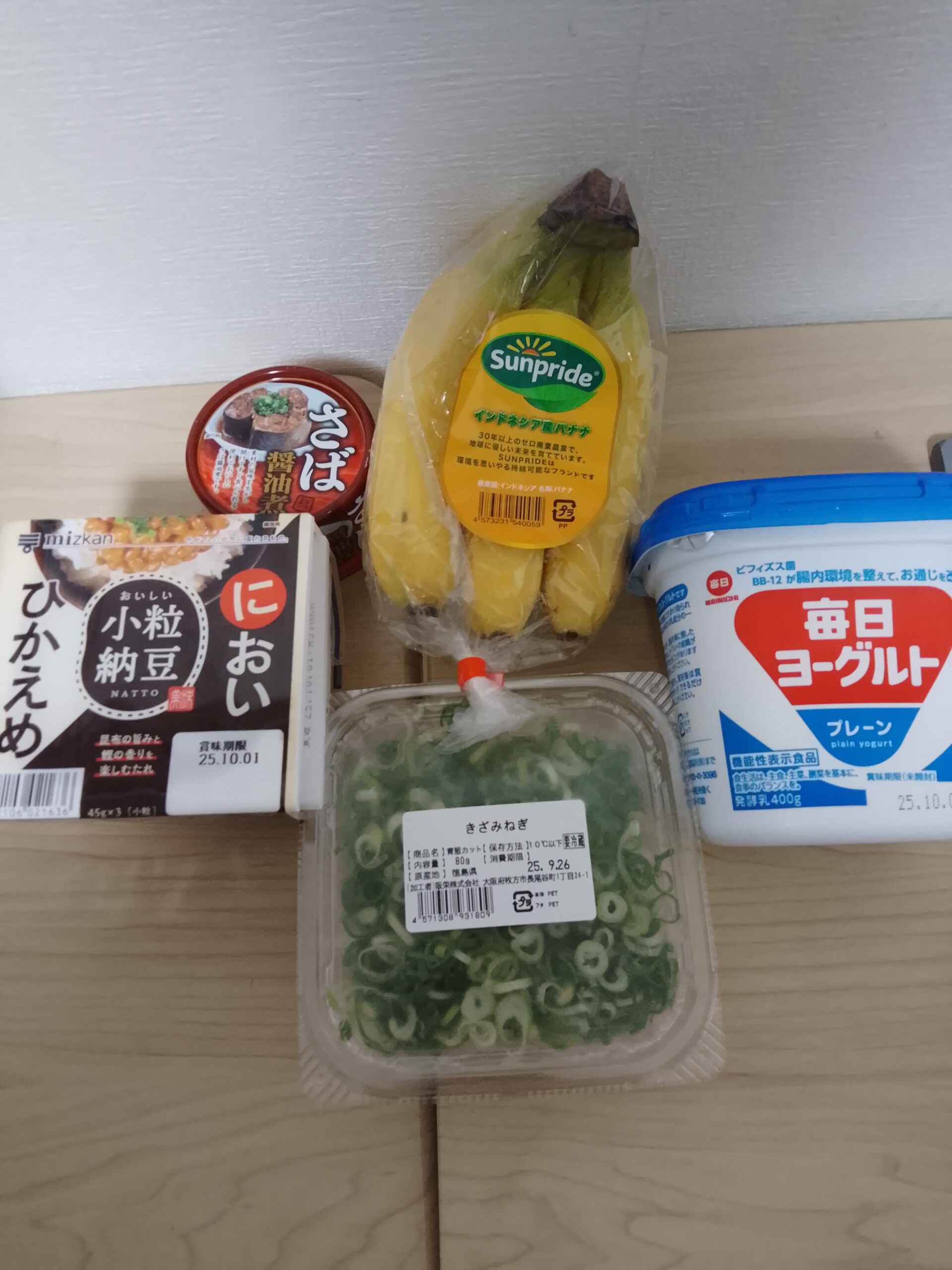 卵、納豆、ネギ、うどん、豆腐、鯖缶、めかぶ、バナナ、ヨーグルト